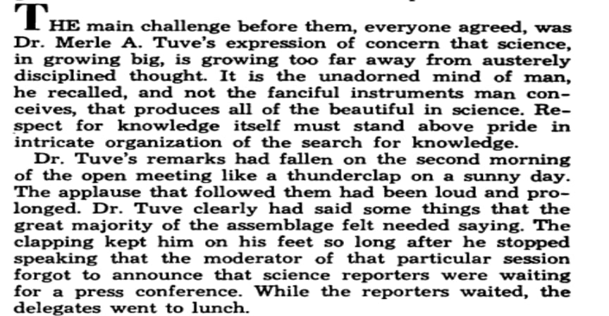 On the second day of the conference, Merle Tuve stood up to give his talk wherein his words fell “like a thunderclap on a sunny day”. He pushed back against the growing obsession with scientific instruments, big laboratories and research projects requiring large teams, observing it was the “unadorned mind of man… not the fanciful instruments man conceives, that produces all of the beautiful in science”.